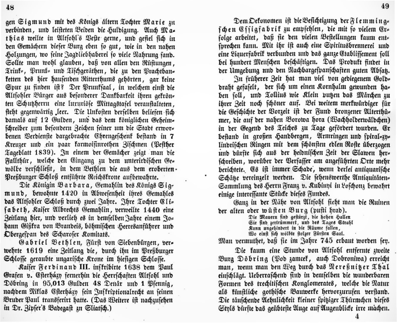 Zipser dosť podrobne opisuje vzťahy medzi rôznymi kráľmi, nález bronzového pokladu a legendu o zlatom drôtiku. Letmo zmieňuje Pustý hrad a Podzámčok, čo je dnes ruina s jedným múrom.